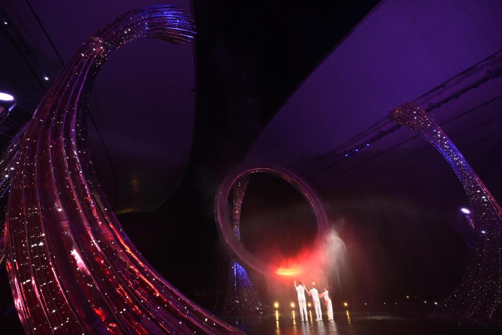 11月9日,火炬手苏炳添(中)、张家朗(左)、李祎点燃主火炬。