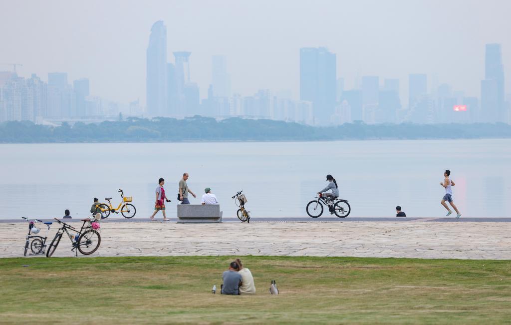 11月15日,在田径项目男子马拉松比赛中,参赛选手经过深圳湾体育中心。