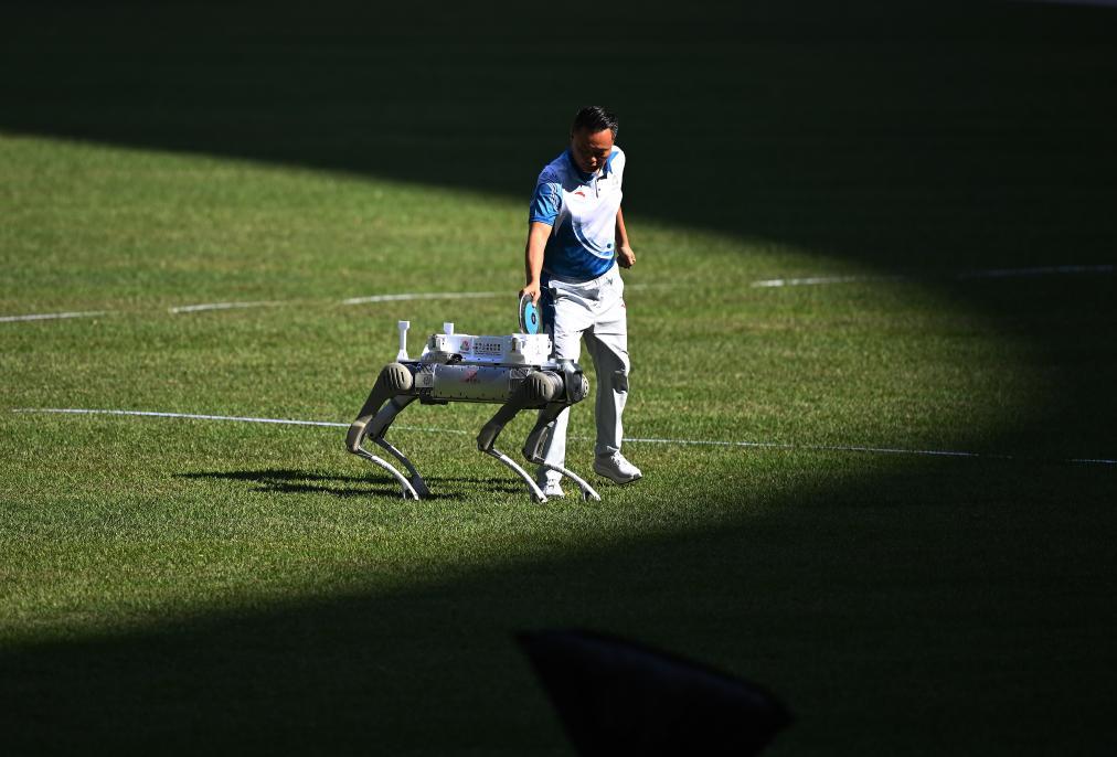 11月17日,在田径项目赛事开始前的暖场活动中,机器人和吉祥物喜洋洋、乐融融在广东奥体中心体育场赛跑。